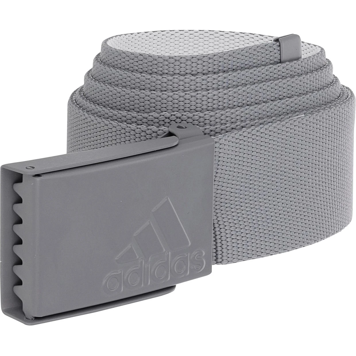 The Adidas Reversible Web belt features an adjustable clamp closure with Adidas logo, is reversible, and a metal end piece