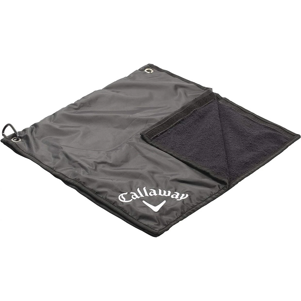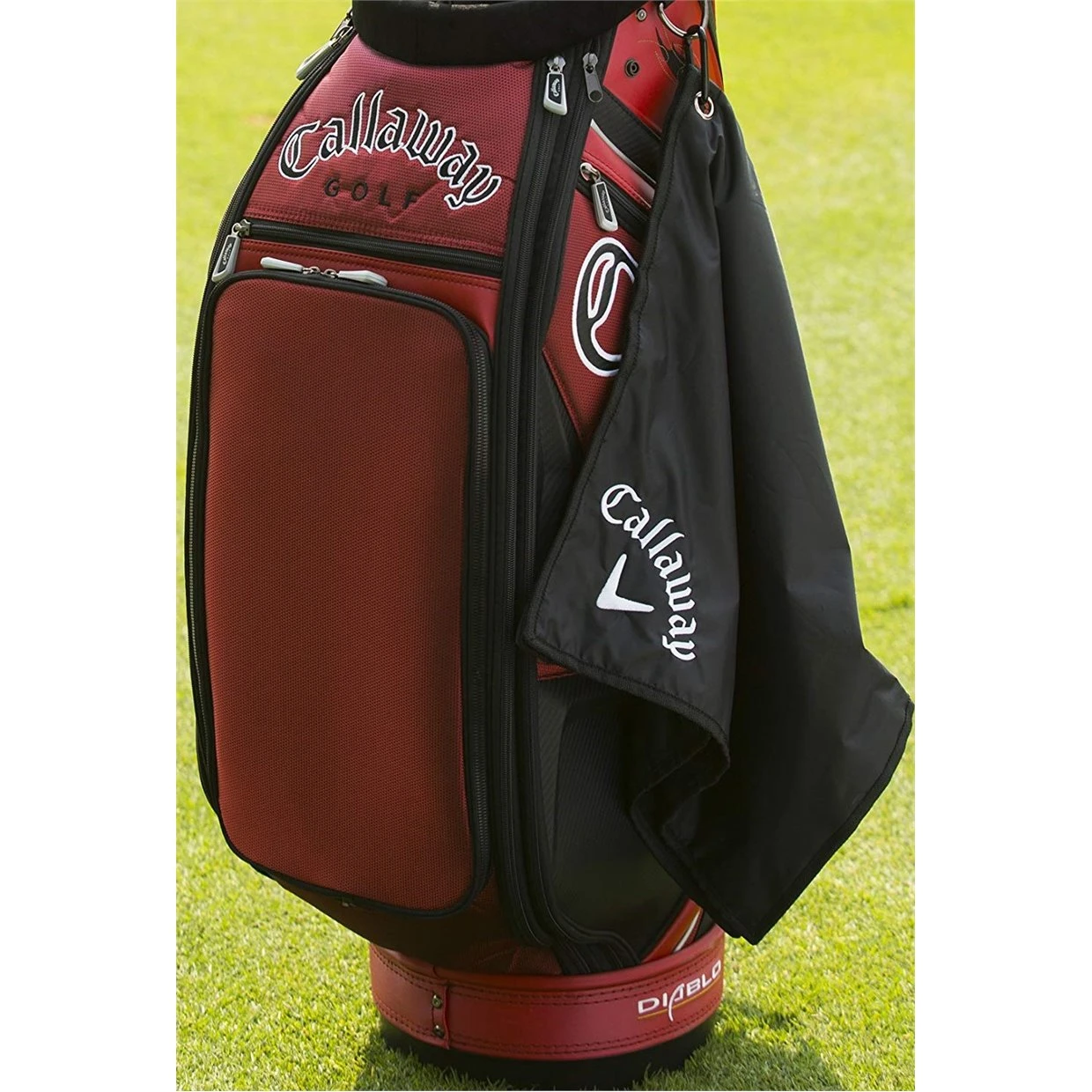 The Callaway Rain Hood Towel is the perfect 2 in 1 combination. It is designed as a rain hood and golf towel. The internal towel is constructed of cotton and the waterproof hood is constructed of nylon. The Rain Hood Towel easily slips over the top of most golf bags to keep your clubs dry. It features Velcro sides for convenient access to clubs and a carbineer clip for hanging the towel on a golf bag.