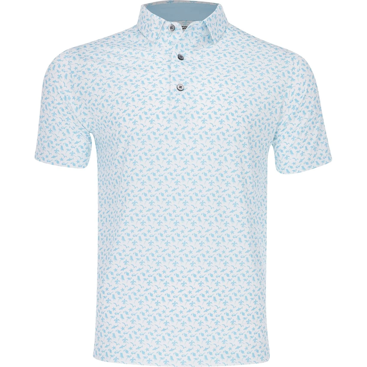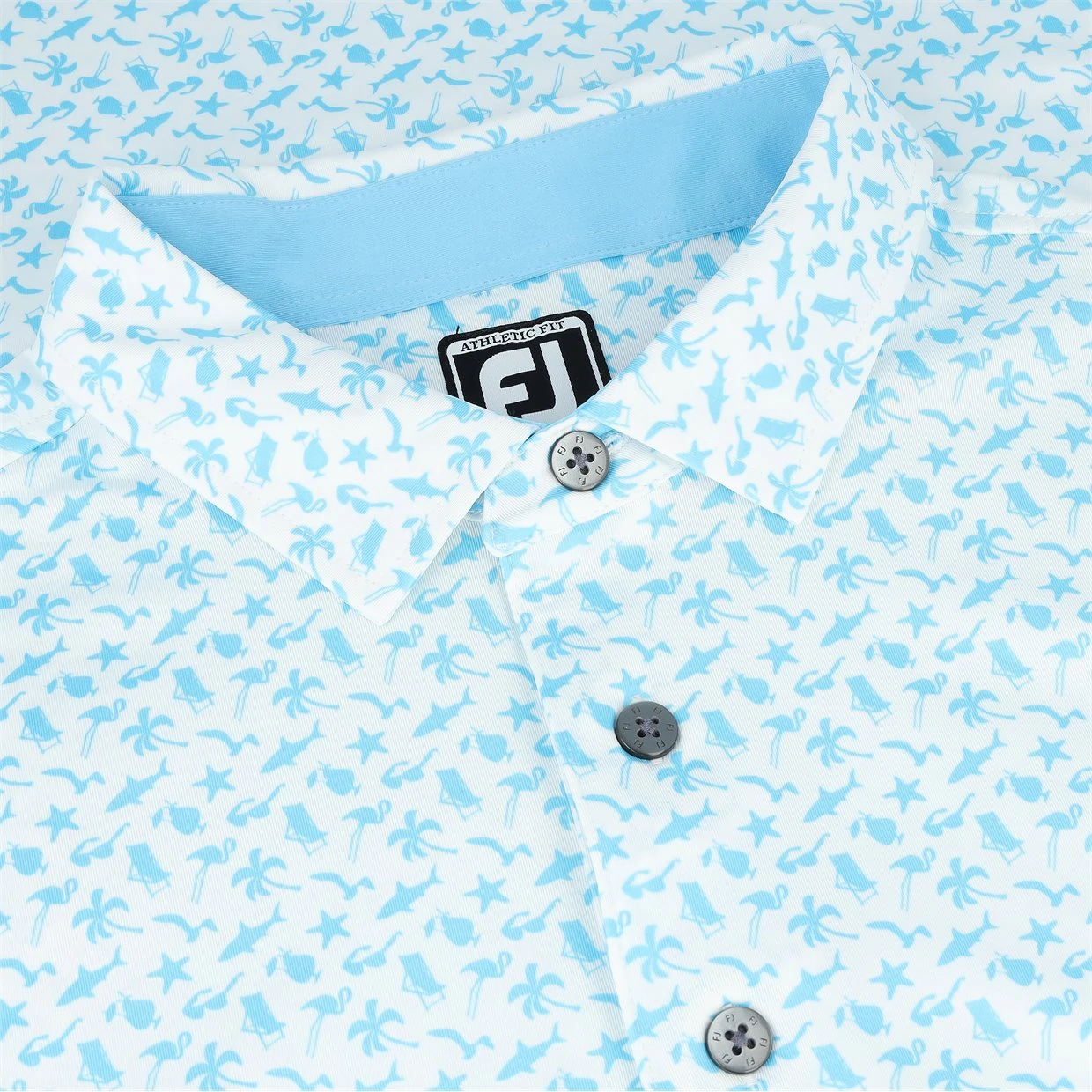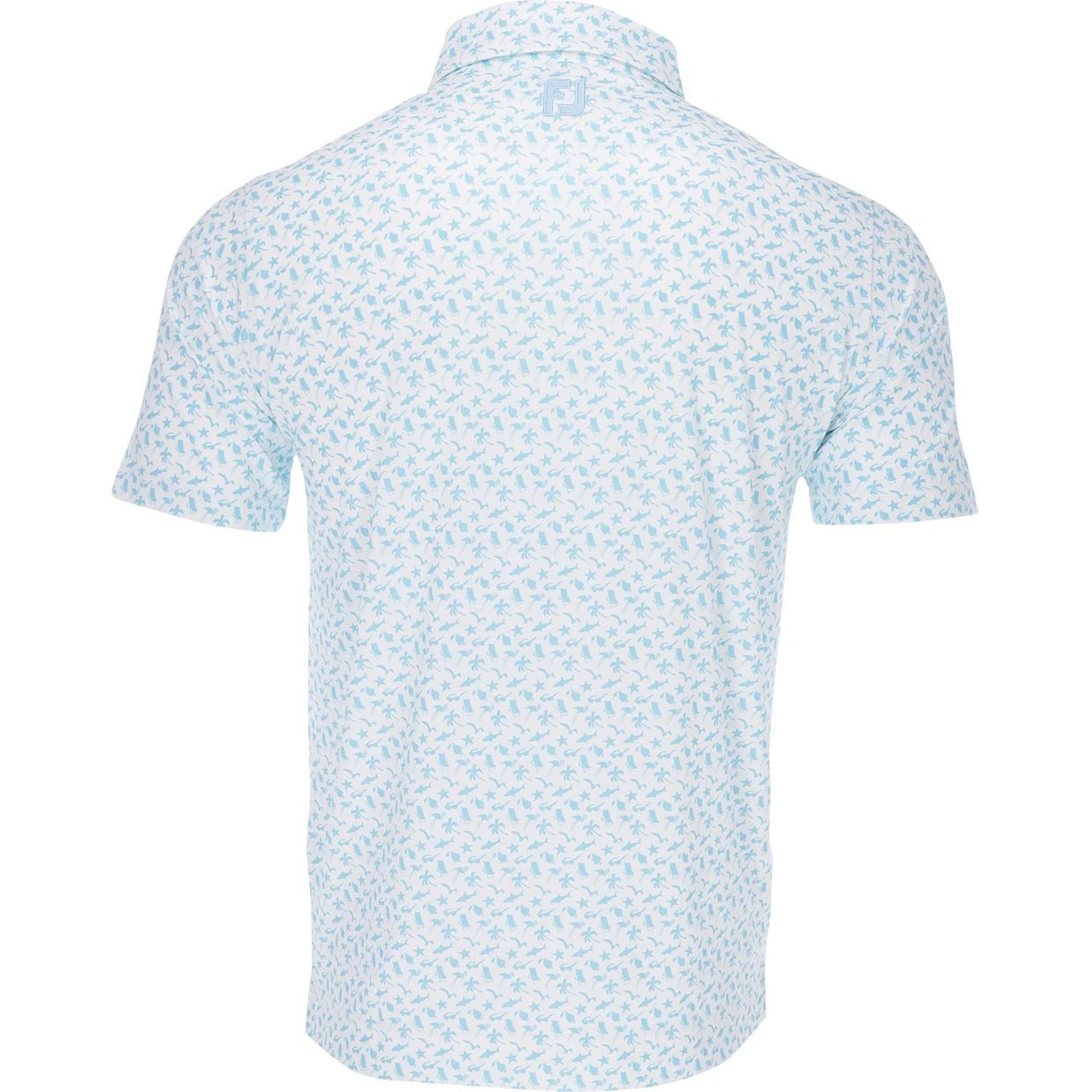 The FootJoy Beach Print Lisle polo offers fashionable detailing as well as performance fabric. The fabric is machine washable with minimal wrinkling or shrinkage. It is also built with stretch, offering comfortable wear and freedom of movement. The fabric is finished with anti-microbial properties to inhibit odor and moisture wicking properties to prevent sweat build up.