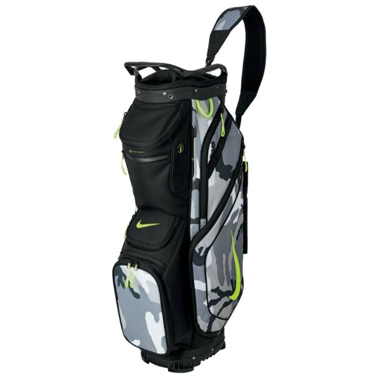 The Nike Performance GB Cart Bag features 14-way, full length dividers for organization, strap-through design for easy cart attachment, insulated pockets for beverages, ball-pocket, water-resistant rain hood and utility webbing to hold accessories