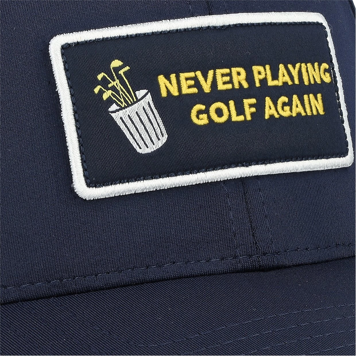 Although some days this is the thought, the Never Playing Golf Again cap is a happy nod to the love of the game. The cap is constructed with stretch, offering comfortable wear and features a curved bill to block the sun from your eyes.